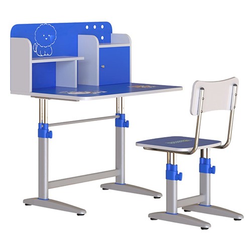 - Bàn & ghế học sinh khung thép, chân đế tôn dập định hình kết hợp gỗ melamine. Giá sách màu trắng kết hợp tấm hậu tôn sơn tĩnh điện có cắt hình trang trí, giá sách có cánh mở để đồ cùng màu mặt gỗ bàn. Kích thước: W800 x D550 x H930-1080 mm