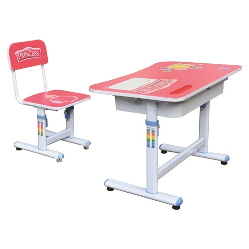 Bộ bàn ghế khung thép, mặt bàn, đệm tựa ghế gỗ melamine in hình con giống.