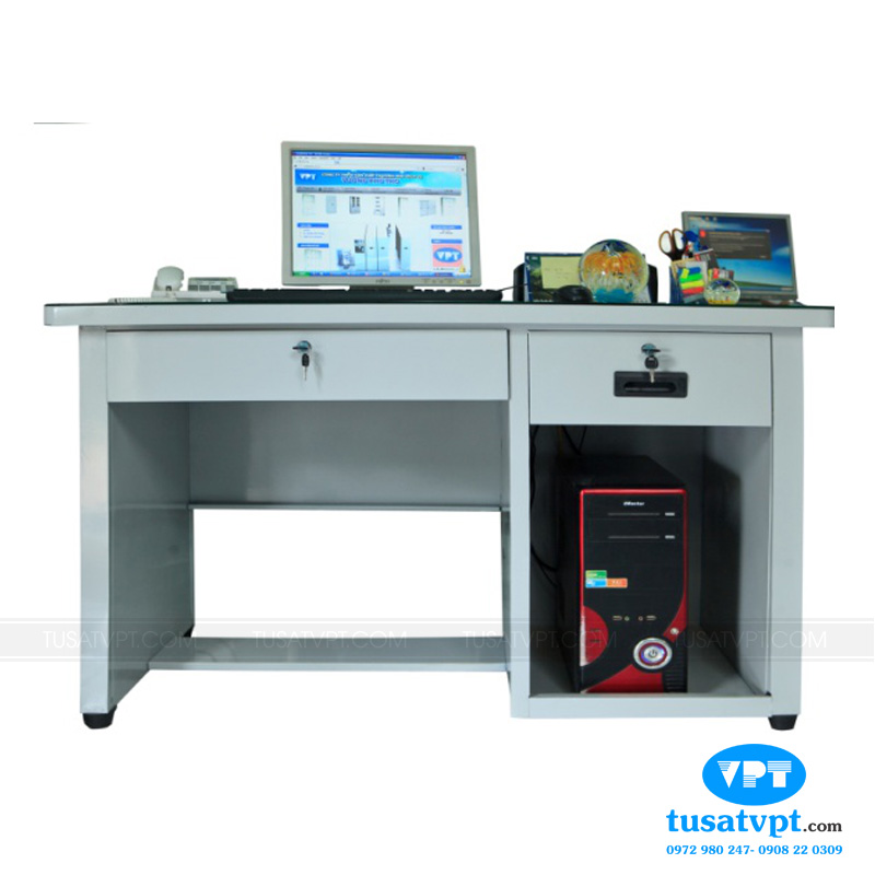 - Bàn sắt để máy tính Kích thước : W 1200 x D600 x H 750 Tủ thép được sơn tĩnh điện chống rỉ sét. Bàn được thiết kế theo tiêu chuẩn VPT Có 2 hộc kéo, khóa riêng biệt Có 1 thanh ngang để chân Được tiếp đất bằng 4 chân cao su điều chỉnh độ cao Toàn bộ tủ được sơn tĩnh điện màu xám chuẩn. + Bàn sắt làm việc được thiết kế phù hợp cho các nhu cầu chứa hồ sơ, đồ dùng cá nhân, mỗi ngăn có ổ khóa riêng, kèm Pat khóa ngoài, trên cánh cữa có gờ để bảng tên, lỗ thông gió. + Thiết kế theo tiêu chuẩn hoặc qui cách theo đặt hàng, gởi kèm bảng vẽ thiết kế theo yêu cầu + Chất liệu thép, sơn tĩnh điện chống rỉ sét, màu sơn thông thường màu xám hoặc theo đặt hàng . + Sản phẩm được cung cấp làm tủ cho công nhân, cho trướng học, bệnh viện, thư viện, viện nghiên cứu …v..v… + Với kinh nghiệm nhiều năm sản xuất Tủ Locker Giá rẻ và luôn ưu tiên về kiểu dàng gọn nhẹ thẩm mỹ cao chịu được tải trọng tốt, ổ khóa dễ thay bảo trì khi dùng lâu năm.