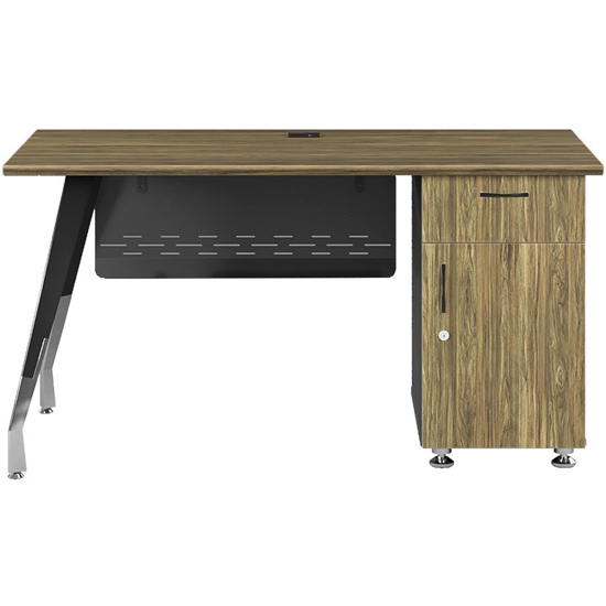 - - Bàn thiết kế khung chân sắt hộc liền, mặt chữ nhật dài 1m4 rộng 700mm - Chân bàn thép dập định hình sơn đen nhám kết hợp mạ - Mặt gỗ melamine vát cạnh 45 độ hai cạnh dài - Bàn có yếm tôn có tạo lỗ trang trí - Hộc liền bàn có 1 ngăn kéo 1 khoang cánh mở. - Sản phẩm Bàn văn phòng hộc liền 1m4 BRI140HLC15 kết hợp với ghế văn phòng sử dụng trong phòng giám đốc, phòng lãnh đạo tạo sự uy nghiêm cho người lãnh đạo. Kích Thước: W1400 x D700 x H750 mm Chất liệu: Mặt gỗ công nghiệp Melamine, chân thép sơn tĩnh điện kết hợp mạ, yếm tôn.