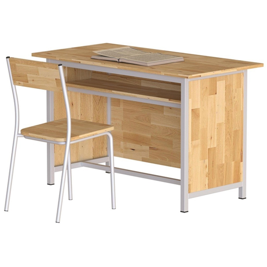 - Kiểu Dáng - Bộ bàn ghế dành cho giáo viên - Thiết kế khung thép sơn tĩnh điện cao cấp. - Mặt gỗ tự nhiên được phủ một lớp sơn trong suốt để bảo vệ bề mặt và giữ được mầu sắc nguyên bản của gỗ. - Sản phẩm Bộ bàn ghế giáo viên BGV101G, GGV101G sử dụng cho giáo viên, giảng viên dùng trong trường PTTH, Đại Học, Cao Đẳng, THCN. Kích Thước: - BGV101G: W1200 x D600 x H750 (mm) - GGV101G: W410 x D470 x H450-830 (mm) Chất liệu: - Khung bàn ghế ống thép sơn tĩnh điện - Mặt bàn và đệm tựa ghế gỗ tự nhiên cao cấp
