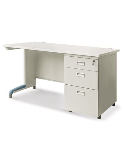 - - Bàn sắt hộc liền , bàn có 1 hộc liền bàn, hộc gồm 3 ngăn kéo đựng tài liệu có khóa, có chân tăng chỉnh. - Chân bàn bằng sắt phủ sơn tĩnh điện cao cấp, sử dụng chân tăng chỉnh độ cao. - Mặt bàn dùng gỗ công nghiệp phủ melamine ( M ) hoặc phủ laminate ( L ) cao cấp. - Kích thước : W1400xD700xH740/760mm.