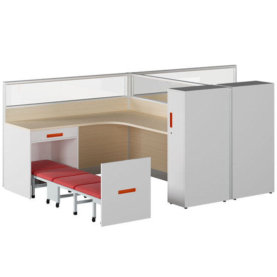 - Thiết kế với module 2 chỗ làm việc, tạo điều kiện thuận lợi cho làm việc đồng thời tối ưu hóa không gian. Mặt bàn được làm từ chất liệu gỗ Melamine với thiết kế lượn, mang đến vẻ đẹp và tính thẩm mỹ cho sản phẩm. Mỗi chỗ làm việc đi kèm với 1 tủ phụ để đồ cá nhân và 1 hộc sắt kết hợp giường gấp, mang lại tính tiện ích và tiết kiệm diện tích cho không gian. Sản phẩm Cụm bàn làm việc kết hợp giường gấp MDGG01 giúp tối ưu hóa không gian làm việc, đồng thời còn mang đến tính linh hoạt và tiện ích cho việc sắp xếp và tận dụng không gian làm việc. Kích Thước: W2000 x D1600 x H750-1200 mm Chất liệu: Gỗ melamine, thép sơn tĩnh điện