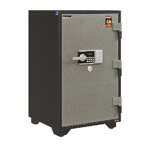 - Két đứng, 1 cánh mở với 3 bản lề nổi lớn, 1 bộ khóa chìa, 1 bộ khóa điện tử, có tay nắm. Cánh mở với 8 chốt chìm. Lòng két có 1 đợt di động và 1 ngăn kéo có khóa. Két có bánh xe sắt di chuyển. - Trọng lượng ~190kg. - Bảo hành 24 tháng. KT NGOÀI 589 x 600 x 988 KT TRONG 416 x 371 x 750