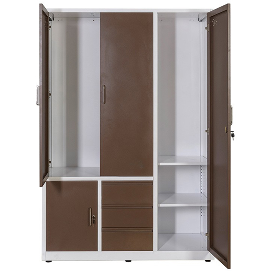 - - Tủ sắt sơn tĩnh điện Hòa Phát - Tủ thiết kế 3 buồng, 4 cánh, 3 ngăn kéo. - Cánh có hoa văn trang trí - Trong khoang 2 cánh ngắn có 1 suốt treo áo. - Khoang cánh sắt dài có 1 suốt treo áo và 2 đợt di động - Sản phẩm Tủ gia đình khung thép TU15B3C4NK3 thiết kế phù hợp cho không gian phòng ngủ gia đình Kích Thước: W1350 x D500 x H1970 (mm) Chất liệu: Sắt sơn tĩnh điện