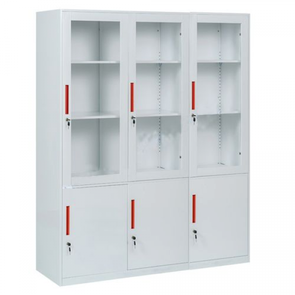 - Màu sắc: Trắng S26 Kích thước: W1367 x D450 x H1830 mm Chất liệu: Sắt sơn tĩnh điện. Tay nắm nhựa Kiểu dáng: Tủ hồ sơ để tài liệu. Phần trên 3 khoang cánh kính, trong có 2 đợt di động. Phần dưới 3 khoang cánh mở.